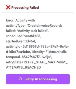 In the Image Vault, you will see a Failed message in the AI Status column along with a red X if processing does not complete. After clicking on the info button, a message will appear similar to below: