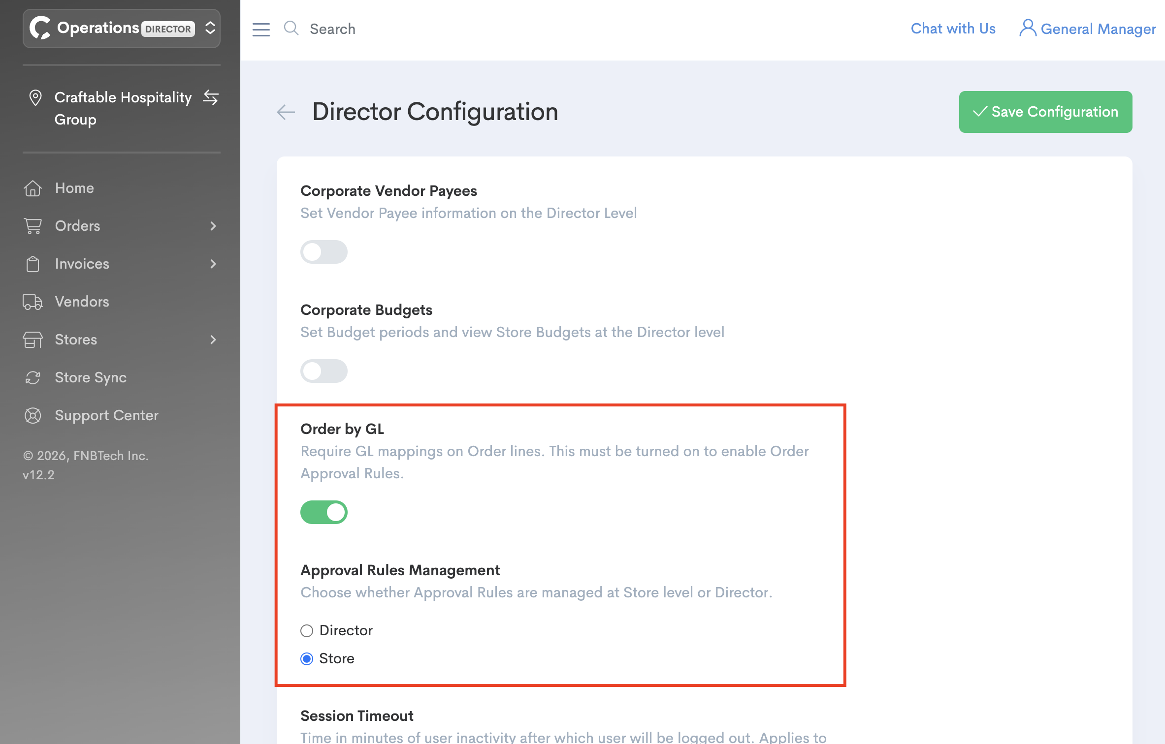 On the Director Configuration page locate the "Order by GL" slider and turn it on. Once active you'll be able to select whether to manage the approval rules at Director or at each Store individually. Then select "Save Configuration" at the bottom of the page.