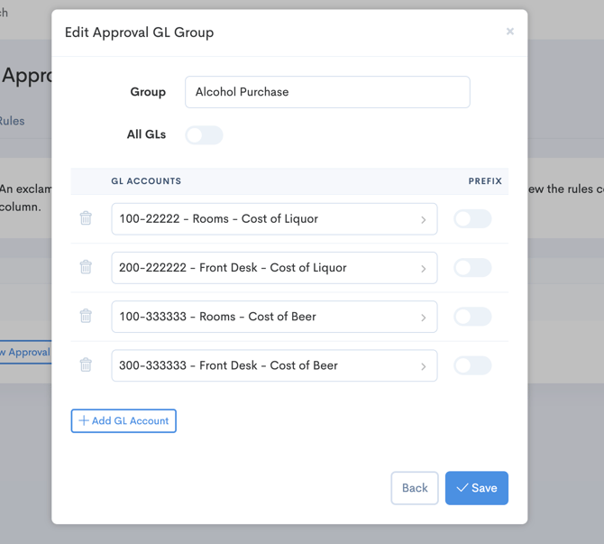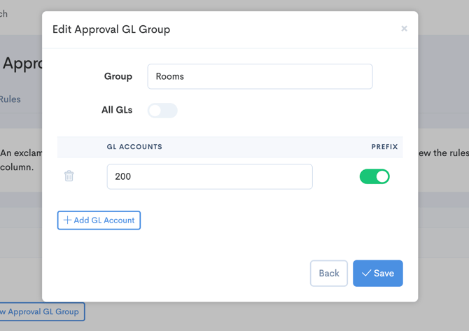 Give the group a name in the "Group" field. Be descriptive, as this will be used to help you identify which grouping of GL codes you selected. Toggle on "All GLs" if you don't want to create GL-specific rules, this means the approval will apply to all purchases. In the GL Accounts table you can select specific GL Codes to apply the rule to, or select Prefix if you would like to enter a GL Prefix.
