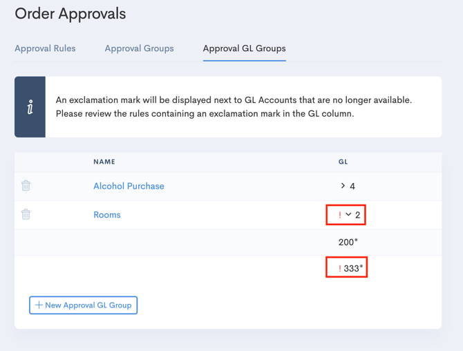 If you enter a prefix that doesn't correspond to your GL codes you'll see this flagged with a red exclamation point on the main Approval GL Groups tab. Click the chevron to open up the list of GLs for clarification.