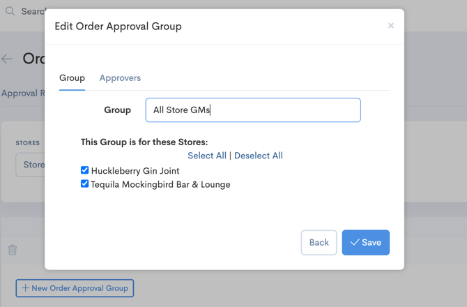 Configuring your Approval Groups is setting which stores the rule will apply to, and then which user/s from those stores will be the Approvers. Click the Approval Groups tab and then click "+New Order Approval Group".