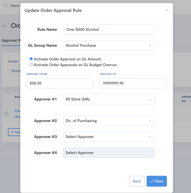 - Activate Order Approval on GL Amount - which means that this approval will happen on all orders who meet the GL and Amount requirements for the selected stores. OR